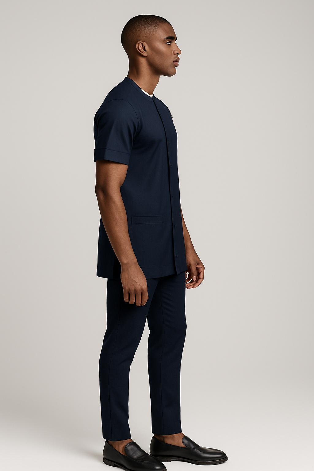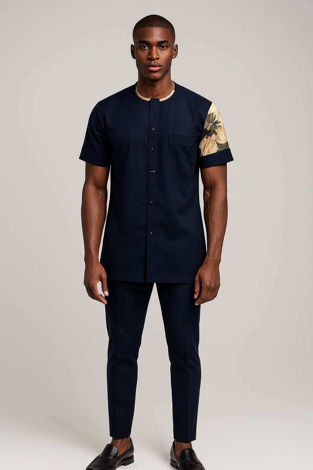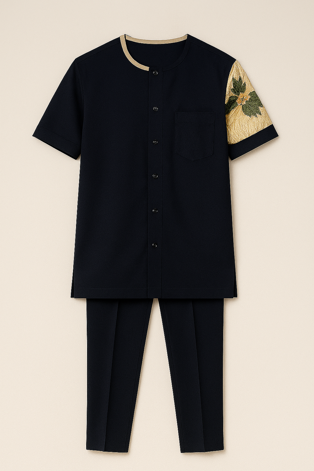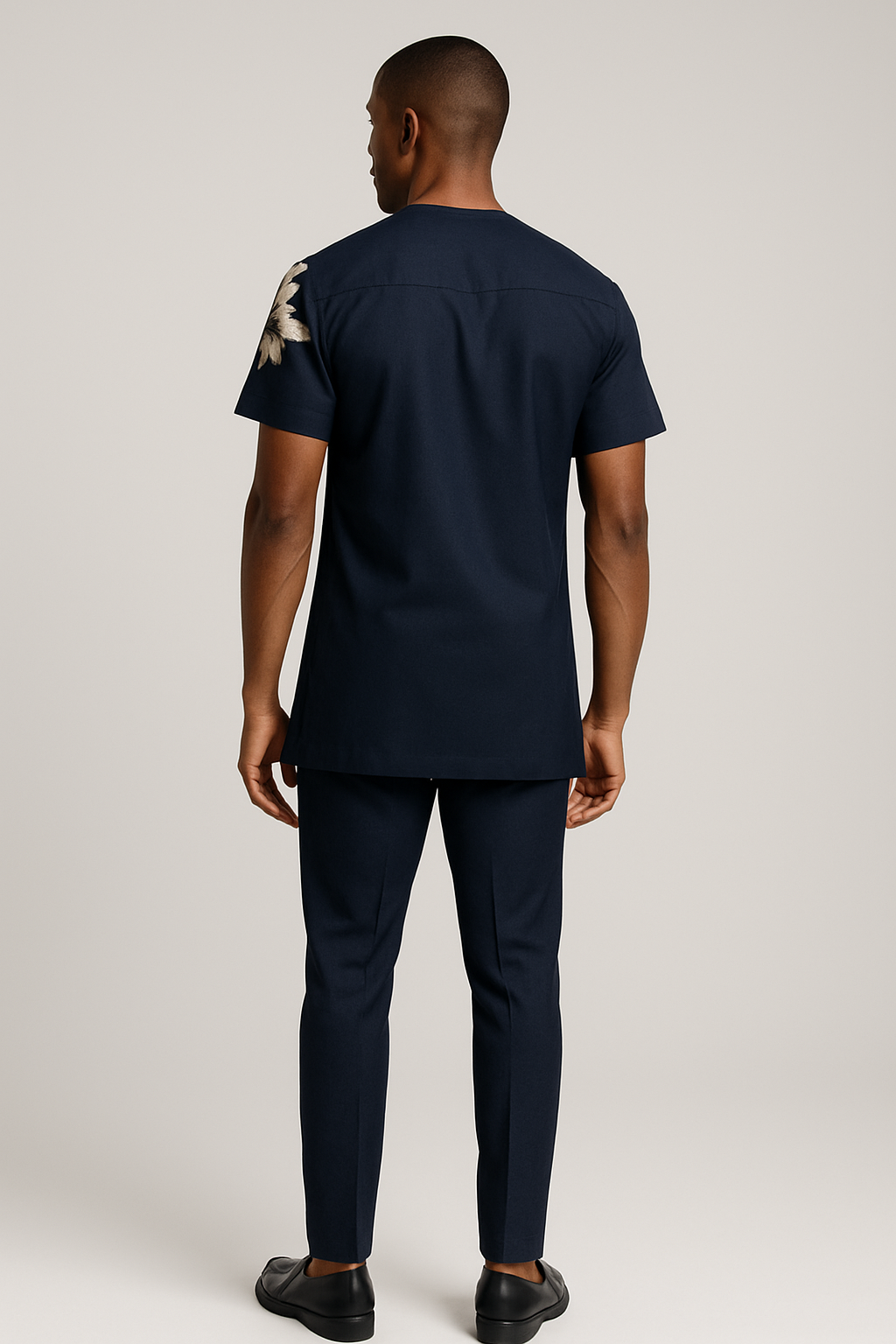 This elegant navy blue short-sleeve tunic set features a subtle botanical print on the right sleeve and a contrast collar detail. Crafted from high-quality fabric, it combines traditional tailoring with modern flair—perfect for weddings, evening events, or elevated casual wear. Comes with matching slim-fit trousers.