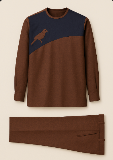 Elevate your style with the Asare Heritage Set, a refined two-piece traditional menswear ensemble that blends cultural heritage with modern tailoring. The tunic features a rich brown base complemented by a navy-blue upper panel, tastefully accented with an embroidered bird motif — symbolizing freedom and resilience. Crafted from premium breathable fabric, the long-sleeve top offers a relaxed yet structured fit, while the matching trousers are sharply tailored with flat-front pleats and minimalist cuffs, perfect for formal occasions or upscale gatherings.