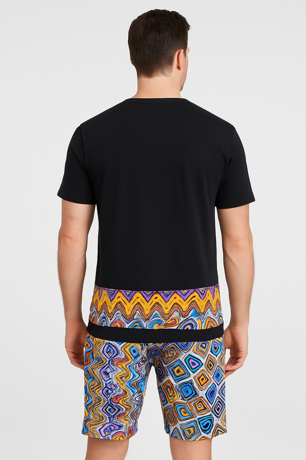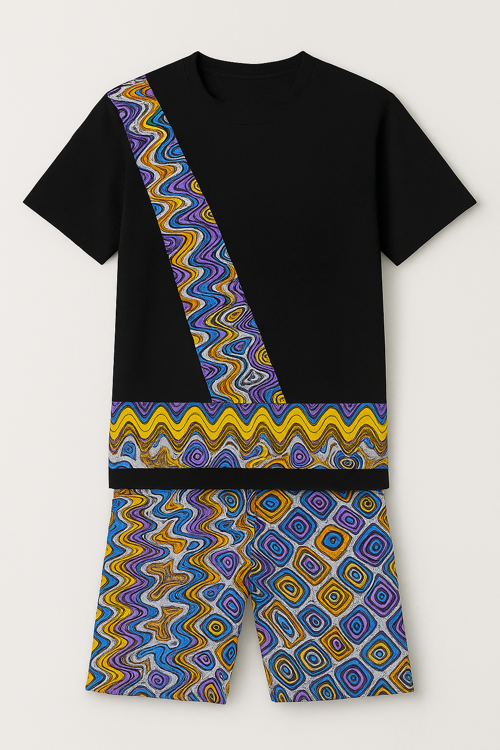 Step into bold expression with the Electric Mirage Set, a dynamic two-piece outfit that fuses contemporary streetwear with vibrant African patterns. The black short-sleeve T-shirt features a striking diagonal panel and hem detail in swirling multicolor prints—perfectly complemented by matching shorts that echo the design in full. Made with lightweight, breathable fabric, this set is built for style and comfort, whether you're out on the town or kicking back in creative flair.