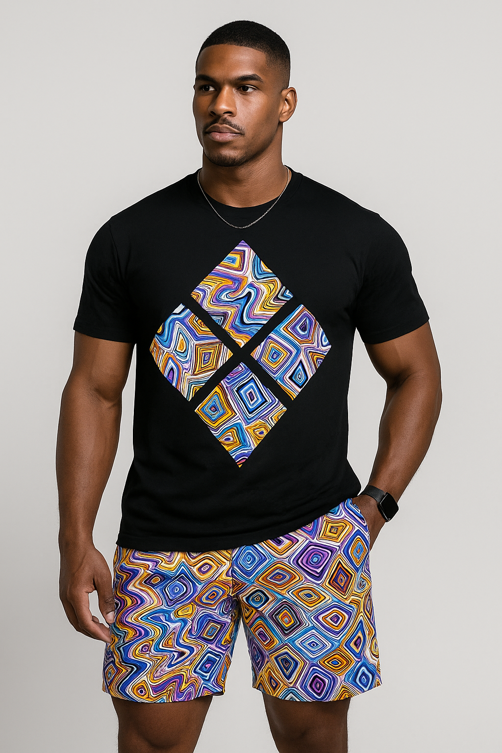 Step into bold energy with the Geo Vibe Set by KayDark — a black short-sleeve tee and matching shorts brought to life with electrifying geometric patterns in purple, yellow, turquoise, and orange. The diamond-cut patchwork on the shirt commands attention, while the shorts mirror the same rhythm with an all-over print that’s unapologetically vibrant. Crafted from breathable, high-quality fabric, this set fuses comfort with style and culture. Whether you’re out making moves or just keeping it chill, this fit was made to stand out.