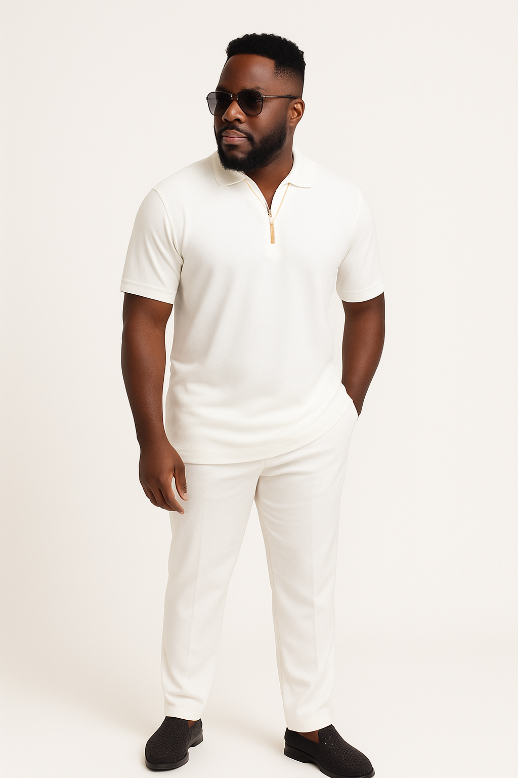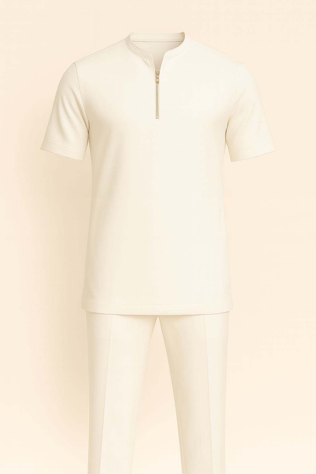 Effortlessly sleek and casual, the Ivory Zip-Collar Kaftan Set offers a modern twist on traditional elegance. This lightweight two-piece set features: