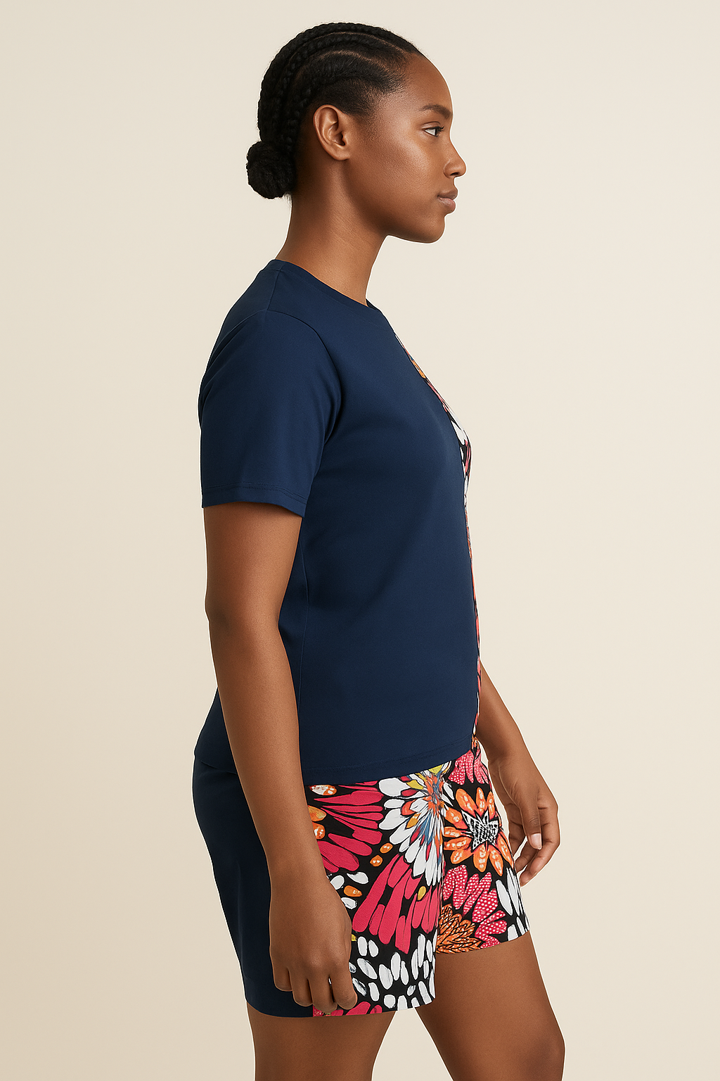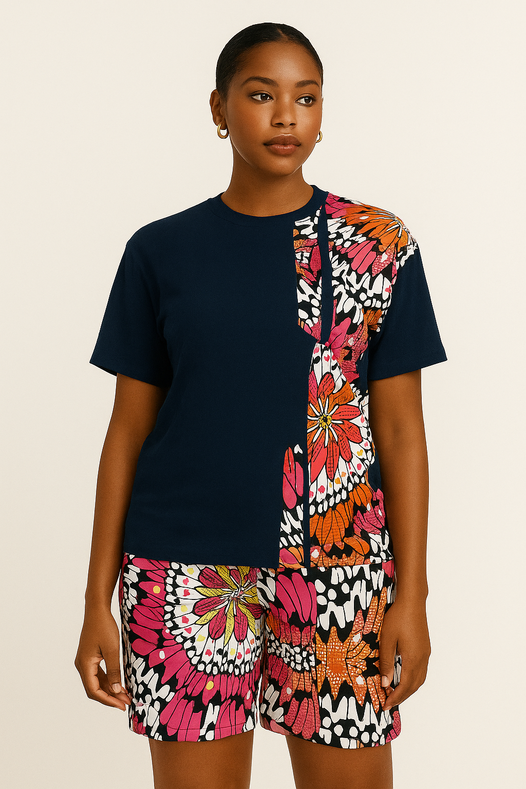 The Midnight Bloom Panel Set is a vibrant two-piece ensemble featuring a navy blue T-shirt with an asymmetrical floral panel in vivid tones of pink, orange, and white. The design flows seamlessly into the matching shorts, which showcase a full bloom of color in bold, eye-catching patterns. Made from soft, breathable fabric, this set blends modern style with traditional African-inspired flair—perfect for turning heads at any casual event or summer outing.