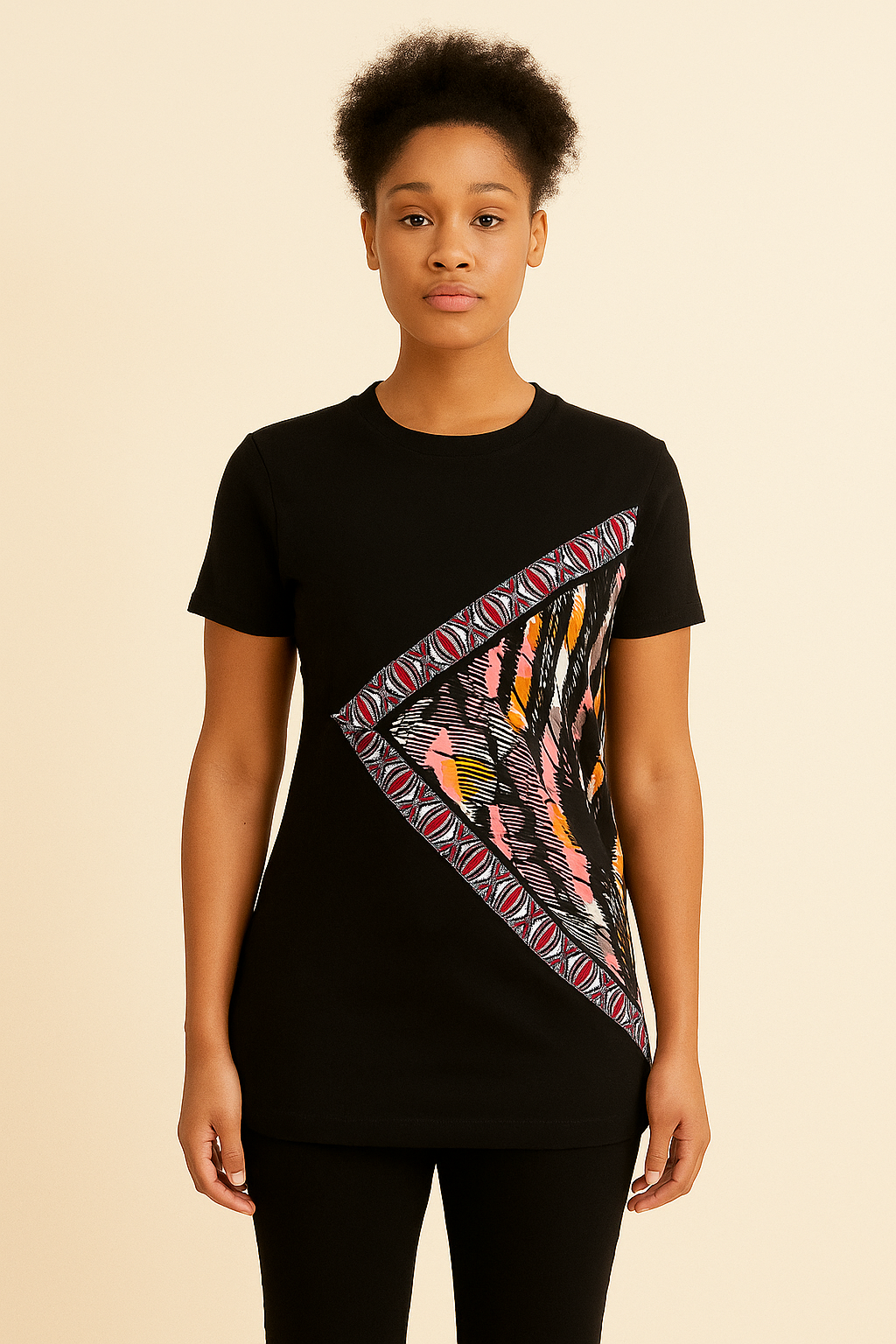 The Midnight Ember Tee is a bold expression of rhythm and fire. This sleek black shirt features a striking triangular panel with vivid flame-like strokes of pink, orange, and silver, bordered by intricate purple tribal motifs. It’s a perfect blend of modern edge and cultural soul — made for those who stand out, not blend in