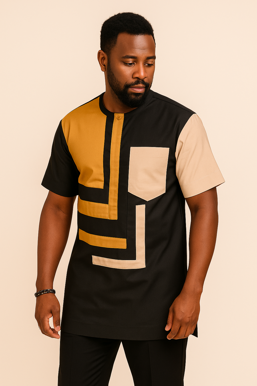 Make a statement in the Royal Axis Kaftan Shirt, designed with bold lines and rich contrast. Featuring a striking gold and tan geometric design on a sleek black base, this short-sleeve shirt redefines modern African style. Tailored for a clean silhouette, it’s perfect for cultural events, smart casual outings, or pairing with your favorite trousers for a standout lo