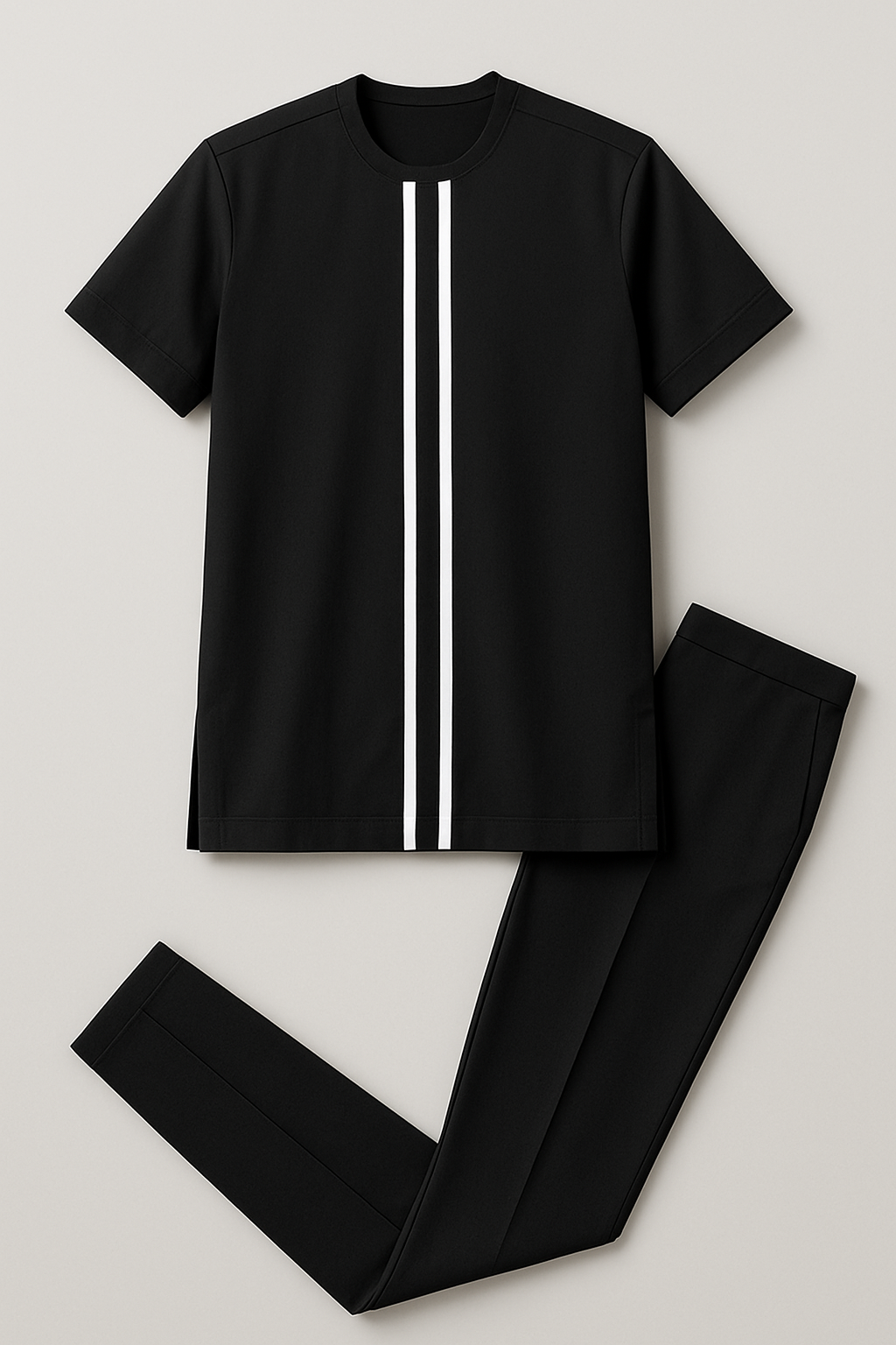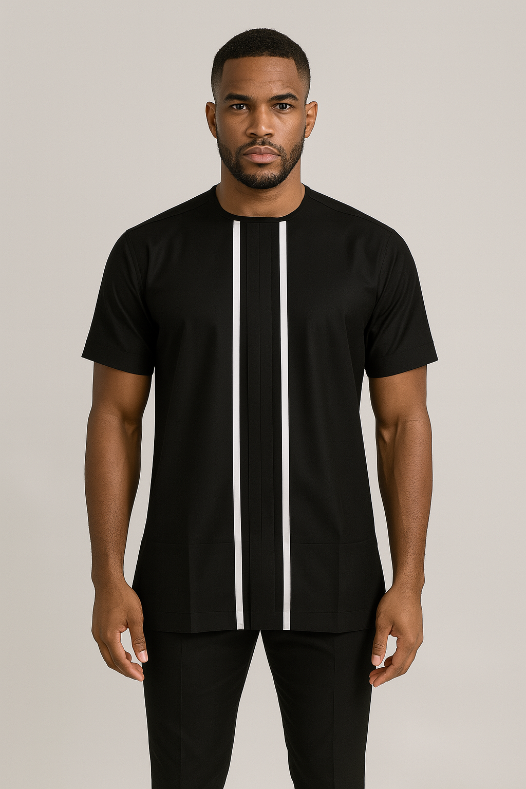 Step into refined minimalism with the Onyx Lineage Set — a sleek, jet-black tunic paired with tailored trousers. The tunic features bold vertical white stripes that draw the eye, giving a modern edge to a clean silhouette. Made from smooth, breathable fabric with a soft structure, this set blends elegance with comfort. Ideal for formal gatherings, night outings, or upscale casual wear.