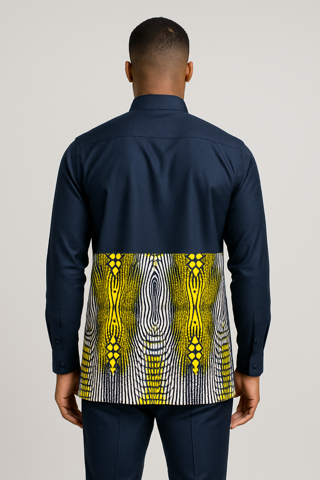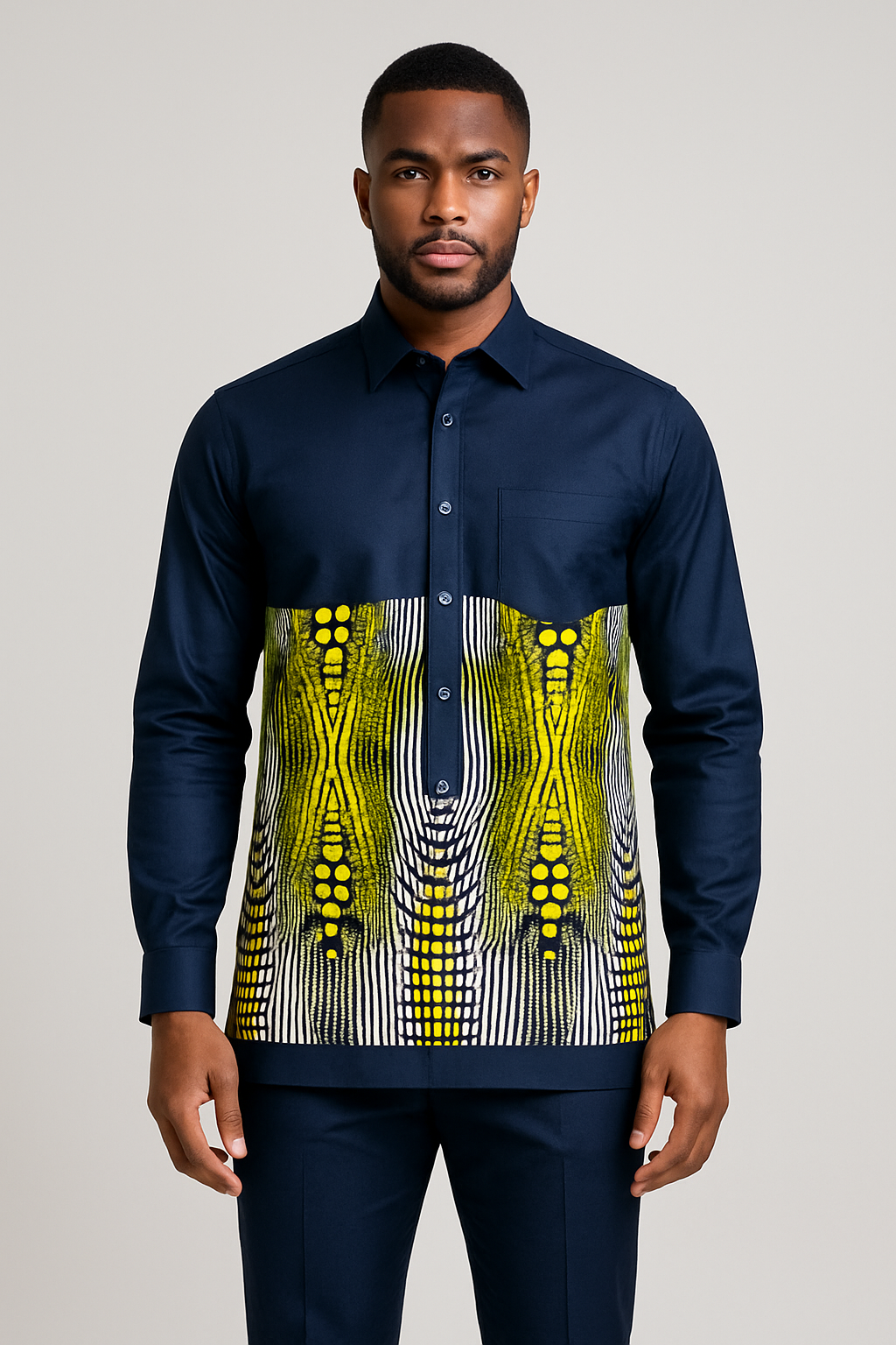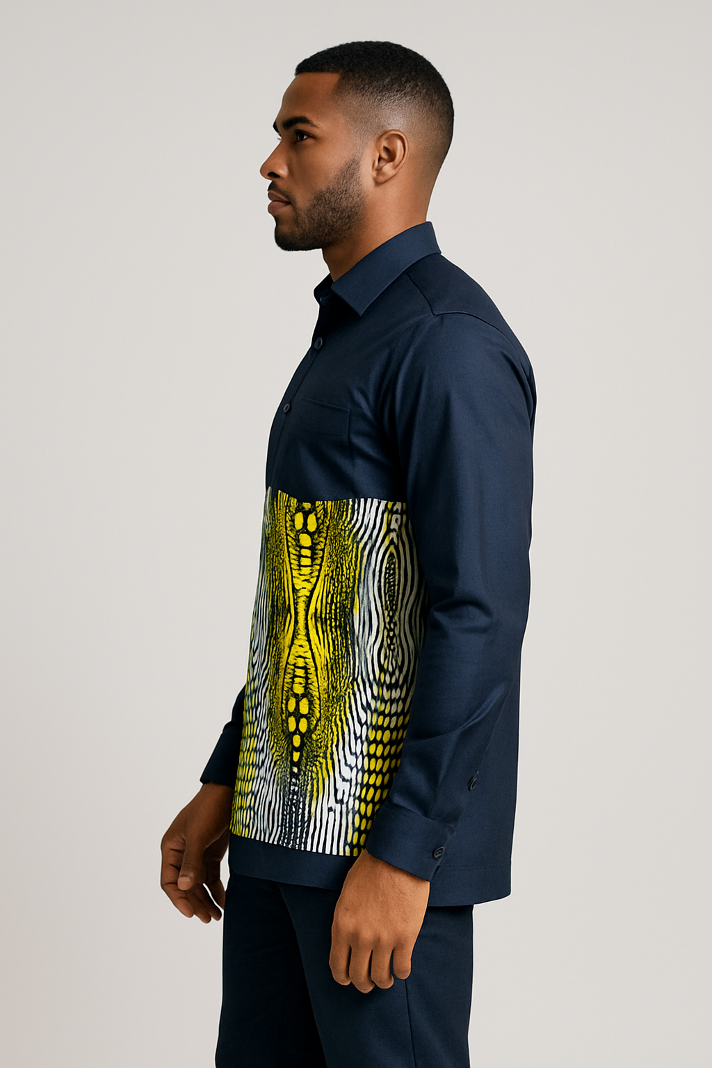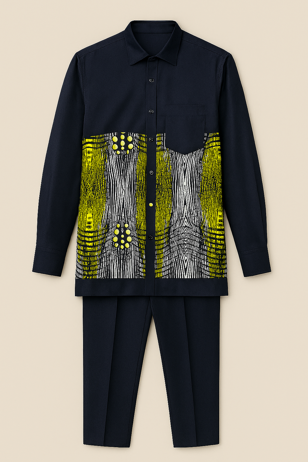 Where tradition meets bold energy — the Royal Volt features a crisp navy tunic with electrifying yellow wax print paneling. Its sharp silhouette and contrast print make it perfect for standout moments, from cultural events to modern ceremonies. Paired with tailored trousers.