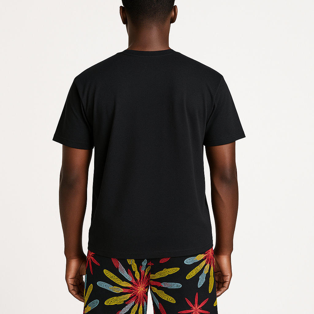 Step into bold expression and cultural pride with the Vibrance Featherburst Two-Piece Set. This eye-catching outfit includes a premium black short-sleeve T-shirt and matching elastic-waist shorts, both featuring radiant Afrocentric feather burst designs in red, yellow, and blue. The shirt’s centerpiece is a powerful, symmetrical burst motif that commands attention and symbolizes energy and unity. Complementing the top, the shorts echo this vibrancy with scattered feather motifs, creating a perfectly coordinated and visually striking fit. Crafted from soft, breathable cotton-blend fabric, this set delivers all-day comfort whether you're at a festival, casual outing, or simply turning heads on the street. Designed for both fashion and cultural connection, this outfit honors African-inspired design with a modern twist.