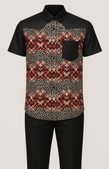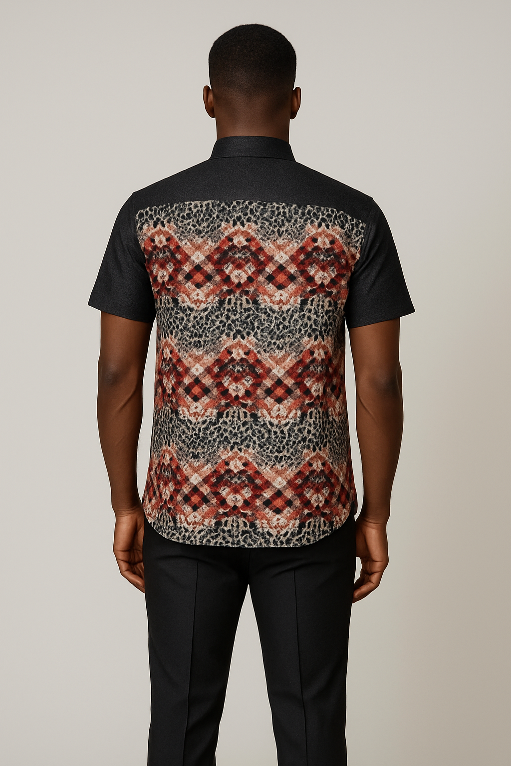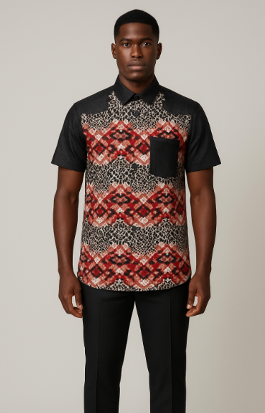 Elevate your look with the Zuberi Fusion Set, where bold tradition meets modern flair. The short-sleeved shirt features a striking red geometric pattern layered over a textured black-and-white animal print, balanced by a sharp black collar and pocket. Paired with tailored black trousers, this set delivers confident style and comfort for both formal occasions and upscale casual outings. Perfect for those who move with pride and purpose.